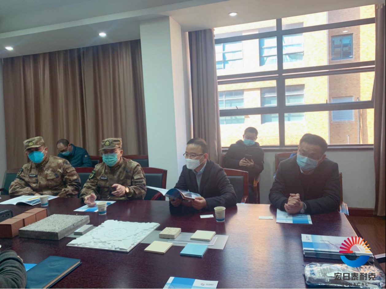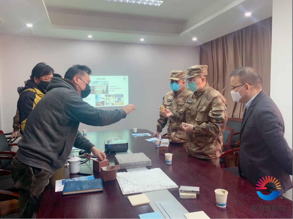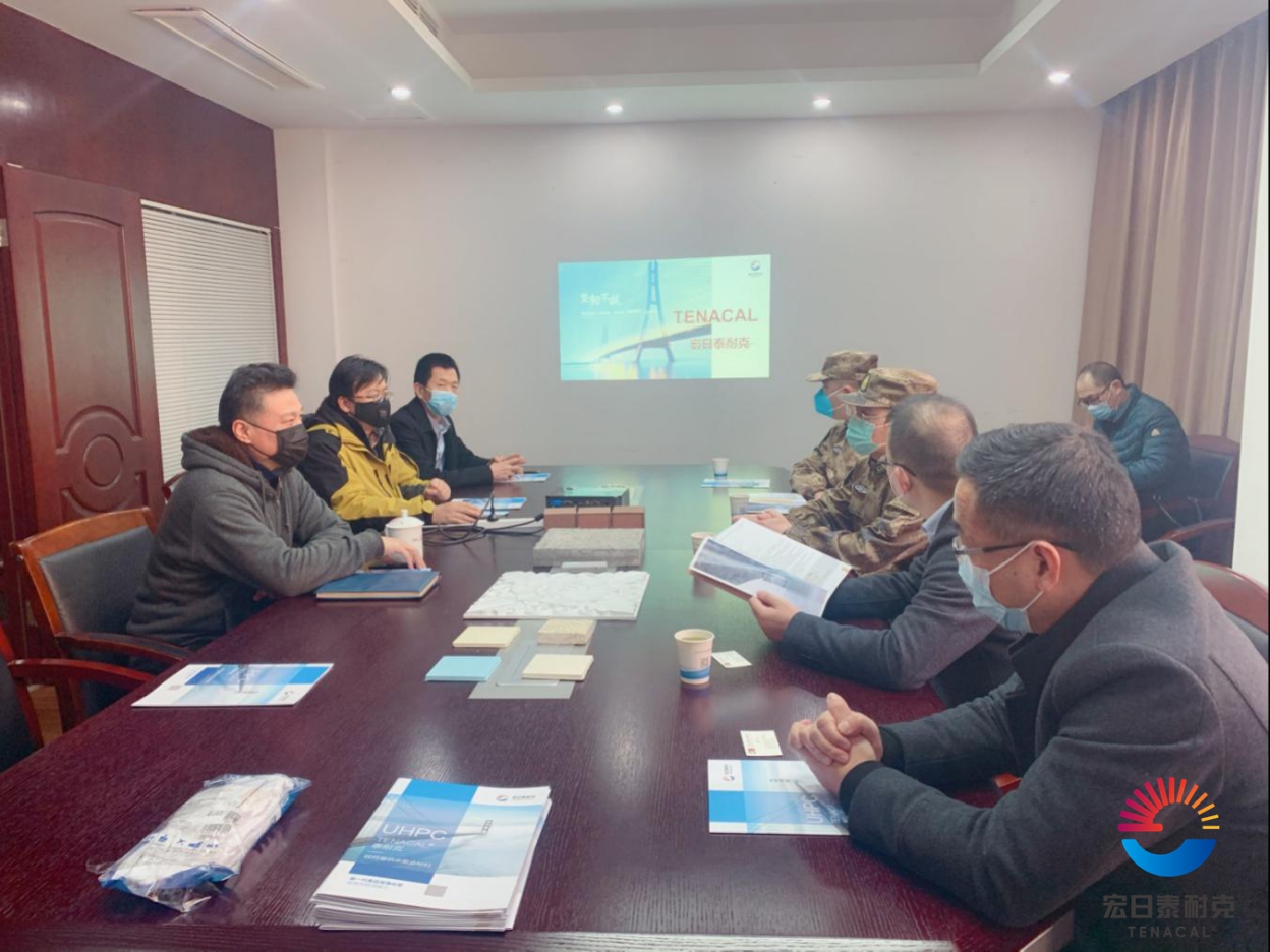隨后,丁總向各位領導介紹了公司的基本情況、UHPC產品的特性和應用領域以及公司重點工程案例。他通過實驗視頻展示了UHPC產品在軍工防爆方面的優異品質,得到了首長的認可和關注。沙司令員和何區長都表示對UHPC的發展前景十分看好,并對中興大橋、機場路延伸段等項目情況進行溝通了解。